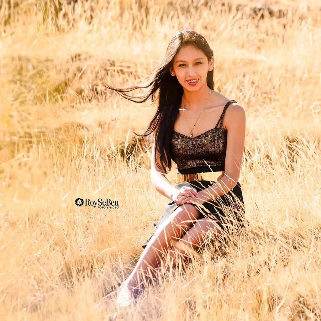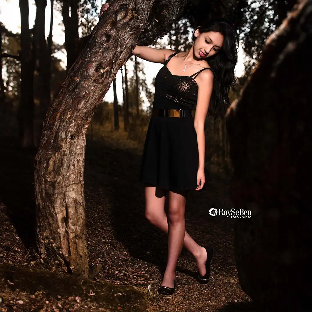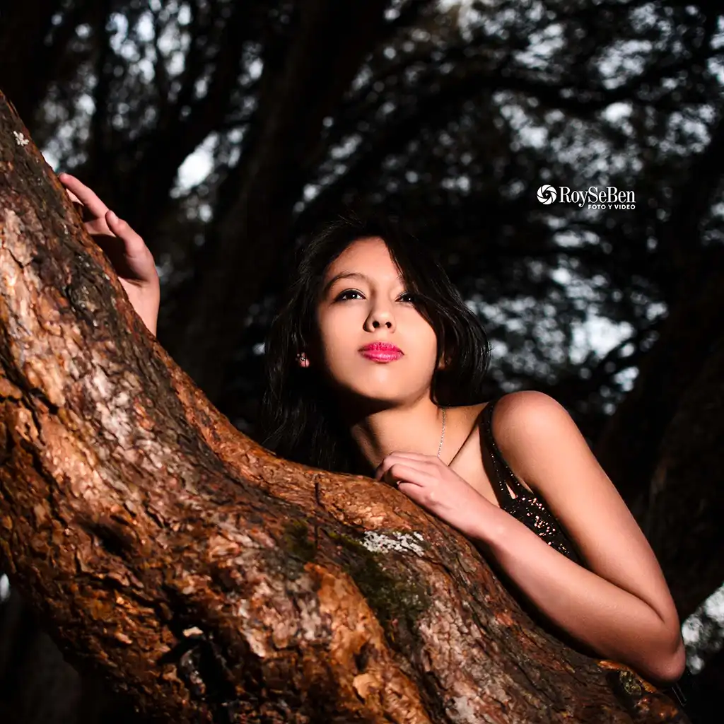 Magia forestal: Fátima brillando en su sesión de quince años entre los misterios del Bosque Dorado.